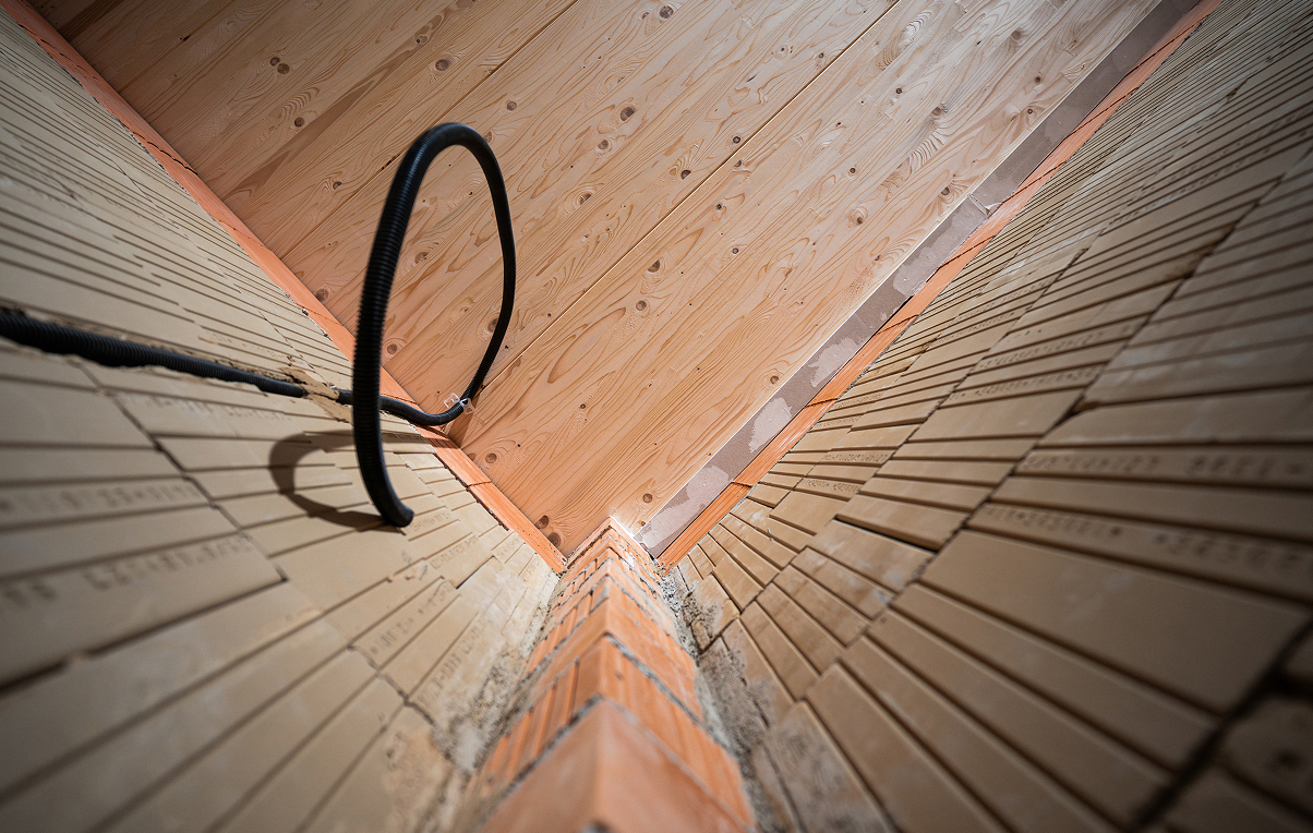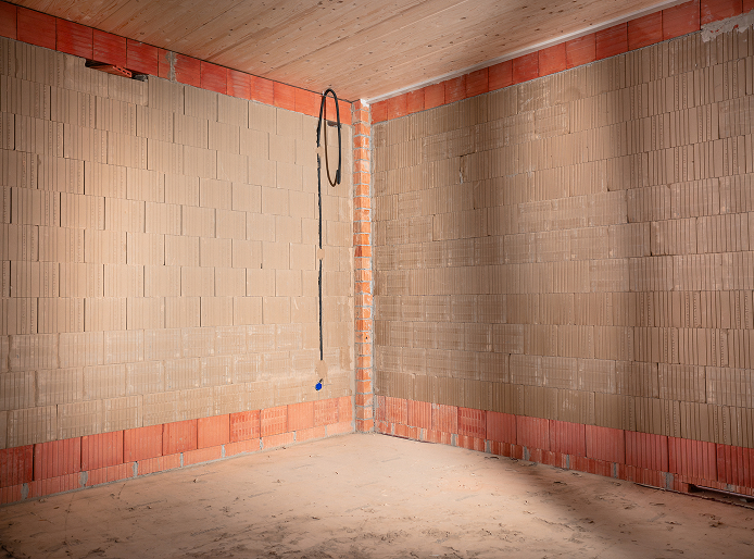 The expansion of the administrative building at Augsburg Waste Management is taking shape, and the interior is currently being finished with clay plaster. For this building, GIMA’s unfired clay bricks were used for both non-load-bearing interior walls and load-bearing interior and exterior walls. For the ceiling connection, a brick U-shaped shell and two mortar leveling layers were used. For reasons of damage prevention, the floor base layers should generally be constructed using moisture-resistant building materials. As with the project in Augsburg, the use of fired vertically perforated bricks is recommended.